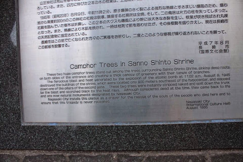 Aber das Krankenhaus war gar nicht mein Ziel, also zurück auf Anfang. Und nun scheine ich auf dem rechten Weg zu sein. Dort ist ein Tori, und somit der Eingang zum Schrein. Die steinernen Laternen stehen hier nicht mehr, sie gehören nun zum Mahnmal am Hypocenter, denn sie sind zwar auf ihren Sockeln verrutscht, aber sie haben den Bombensturm aufrecht überstanden. Der Eingang zum Schrein wird flankiert von zwei riesigen Kampferbäumen, die zwischen 500 und 600 Jahren alt sind. Im Moment der Explosion wurden sie sofort entlaubt, beim rechten Baum der Stamm gespalten. Man ging davon aus, dass die Bäume abgestorben sind. Aber im Frühling 1947 zeigte sich das erste Grün an den verbrannten Stümpfen und heute, nach fast 70 Jahren sind beide Kronen wieder dicht belaubt und bilden ein grünes Dach auf dem Weg zum Schrein. Es gibt eine Leiter an einem der Bäume, und man kann in den Spalt in dem Stamm sehen, in dem noch Scherben, Reste von Ziegeln und Glassplitter zu sehen sind, die durch die Wucht der Explosion umhergeschlendert wurden. In seinem Buch "Die Glocken von Nagasaki" schrieb der Doktor, das er immer die Zikaden hörte in den Kampferbäumen, wenn er im Krankenhaus arbeitete, dass das ein Höllenlärm war, und von der Stille, als sie nicht mehr da waren. Früher wurden die Bäume von den Menschen, die in Nagasaki geblieben waren, umarmt, sie waren das Symbol ihrer Wiederauferstehung, heute gehören sie zum Nationalen Kulturerbe.