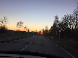 Obwohl es weder trüb noch grau ist, ist es doch Ende November und bald wird es dunkel werden, also fahren wir zurück, mit dem Sonnenuntergang in Richtung Stralsund, wo wir von einem Vollmond am wolkenlosen Himmel begrüßt werden. Das Leben ist schön.