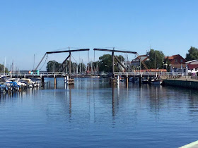 Let's go. Passing along enchanting streets lined with trees, kind of parallel with the coast line, we turn our back to Greifswald and reach the small place Wieck, a tiny fishermen village at the little river called Ryck. Due to that circumstance Wieck got one of its attractions - a wooden drawbridge about 130 years old. Built in 1887 after the model of a Dutch bascule bridge it is one of a few remaining bridges of that kind from this time. That makes it a technical memorial, a subject for painter and photographers and a traffic way. Multitasking.